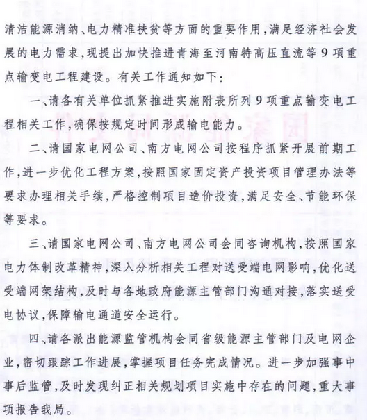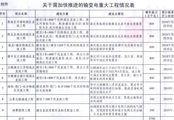 9月7日獲悉,國家能源局印發(fā)《關(guān)于加快推進(jìn)一批輸變電重點(diǎn)工程規(guī)劃建設(shè)工作的通知》國能發(fā)電力〔2018〕70號(hào),《通知》指出,為加大基礎(chǔ)設(shè)施領(lǐng)域補(bǔ)短板力度,發(fā)揮重點(diǎn)電網(wǎng)工程在優(yōu)化投資結(jié)構(gòu)、清潔能源消納、電力精準(zhǔn)扶貧等方面的重要作用,加快推進(jìn)青海至河南特高壓直流、白鶴灘至江蘇、白鶴灘至浙江特高壓直流等9項(xiàng)重點(diǎn)輸變電工程建設(shè),合計(jì)輸電能力5700萬千瓦(工程見附件)。