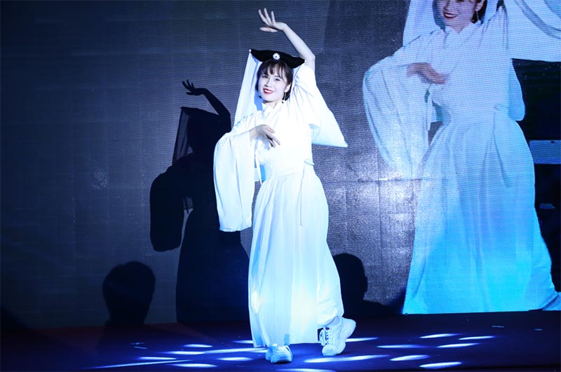第九個節(jié)目是公司店慶舞蹈總指揮帶來的獨(dú)舞《白蛇傳說》,優(yōu)柔舞姿,翩翩入戲