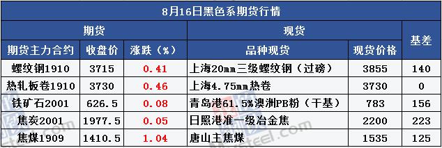 Macro-information The National Development and Reform Commission held a press conference on macroeconomic performance: & GT; & GT; In July, CPI and PPI were in a moderate range, and prices are expected to remain stable for some time to come. & GT; & GT; In response to the apparent increase in food prices, several provinces have issued temporary subsidies in a timely manner. We will promptly issue and implement the Action Plan for Promoting the Reasonable Growth of Income of Urban and Rural Residents(2019-2020), so as to increase the income of residents and increase their ability to consume. & GT; & GT; From January to July, electricity consumption for the whole of China was 4.1 trillion kilowatt-hours, an increase of 4.6 % year-on-year. Among them, primary, secondary, tertiary and residential electricity consumption increased by 5.2 percent, 2.8 percent, 9.1 percent and 8.8 percent respectively, respectively, while tertiary and residential electricity consumption continued to grow rapidly. ○ Ministry of Finance: From January to July, corporate income tax totaled 3036.9 billion yuan, an increase of 4 % year-on-year. Individual income tax was 643.3 billion yuan, down 30.3 % year-on-year. ○ Foreign Exchange Bureau: In the second quarter, domestic financial institutions made a net outflow of 7.508 billion yuan to foreign direct investment, and foreign investors made a net inflow of 10.134 billion yuan to domestic financial institutions. Central Bank: In July, the bond market issued 3.9 trillion yuan of various types of bonds; Inter-bank money market transactions totaled 90.6 trillion yuan, an increase of 17.23 % year-on-year, and an increase of 21.74 % over the previous month. The average monthly interest rate on interbank lending was 2.08 %, which was 38 basis points higher than the previous month. The State Administration of Taxation, the Ministry of Finance and the General Administration of Customs decided to promote the pilot project of the general taxpayer qualification of value-added tax in the comprehensive bonded area. <UNK> Hainan: From August 16th to the end of the year, it launched the "Action to Ensure the Sustainable and Healthy Development of the Economy of the Province, Ensure the Full Implementation of All Reform Policies", aimed at accelerating the development of kinetic energy transformation and accelerating the construction of free trade zones(Hong Kong). 031. Renminbi exchange rate: The central price of the renminbi against the US dollar was 7.0312, which was 44 basis points lower than the previous trading day. <UNK> SHIBOR: overnight shibor reported 2.6650 %, an increase of 0.60 basis points; 7 days shibor reported 2.6730 %, a decrease of 0.50 basis points; Shibor reported 2.6660 % in three months, up 0.50 basis points. Spot market Futures stock market Industry News <UNK> Building materials trading volume: On August 16, Mysteel's daily trading volume of building materials for traders across the country was 194,800 tons, an increase of 20,500 tons from August 15. <UNK> Iron ore turnover: On August 16th, the total number of iron ore deposits in the country's main port was 82,400 tons, a decrease of 31.79 % over the ring; The average daily turnover last week was 1.063 million tons, and the average daily turnover last month was 1.1289 million tons. Mysteelshenyibing: Demand for steel in the off season is still erratic, and this week's fall in steel inventories eased pessimism, but the road to deconversion remains bumpy. It is expected that short-term steel prices will not rebound strongly, and there are still repeated shocks. -Mysteel Research: & GT; & GT; Sample of 230 independent focus companies: capacity utilization rate 74.66 %, a decrease of 0.84 %; The average daily output of 667,800 tons decreased by 7,500 tons; The coke inventory was 752,400 tons, a decrease of 55,400 tons; The total inventory of coking coal was 14,363,600 tons, an increase of 18,800 tons, and the average number of days available was 16.17 days, an increase of 0.20 days. & GT; & GT; The iron ore inventory of 45 ports was 1,601.24, which was 249.51; The average daily total of 254.65 Hong Kong dropped 39.24. & GT; & GT; The blast furnace operating rate of 247 steel mills was 81.07 %, and the ring was down by 1.63 %, an increase of 2.32 % year-on-year; The utilization rate of blast furnace ironmaking capacity was 82.25 %, the ring ratio increased by 0.21 %, the year-on-year increase was 3.1 %, the profit rate of steel mills was 78.14 %, the ring ratio was 6.48 %, and the average daily iron water output was 2.3002 million tons, and the ring ratio was increased by 0.66 million tons, a year-on-year increase of 86,600 tons. Effect of production restriction on scrap steel demand: & GT; & GT; Sichuan region: According to Mysteel's understanding, the inventory of the mainstream arc furnace factory in Sichuan is currently low, the consumption is also much lower than normal, and the cumulative consumption is reduced by 0.5-9 ,500 tons/day. Details & GT; & GT; & GT; & GT; Shandong region: According to Mysteel's understanding, the daily reduction of waste steel usage in Shandong is 0.65-7 ,400 tons, mainly by reducing the use of waste steel in the converter. Details & GT; & GT; <UNK> Hebei Bureau of Industry and Information Technology issued a production capacity replacement plan announcement: & GT; & GT; Xingtai Iron and Steel Co., Ltd. plans to start construction of two new 1200 M3 blast furnaces with a production capacity of 2.26 million tons on May 31, 2019; 100t converter 2, production capacity 2.3 million tons. & GT; & GT; Tangshan Guotang Iron and Steel Co., Ltd. plans to build a new coal cake volume of 67 cubic meters 16 * 18 holes of heat recovery Coke furnace, production capacity of 1.76 million tons. ○ Xuzhou Ecological Environment Bureau: Published the "Xuzhou City to Further Strengthen the Work Plan for the Prevention and Control of Air Pollution", and proposed that since August, We will examine